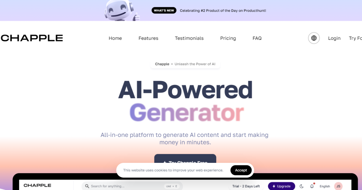 Chapple is an all-in-one platform that empowers users to effortlessly generate text, image, code, chat, and much more using AI technologies.
