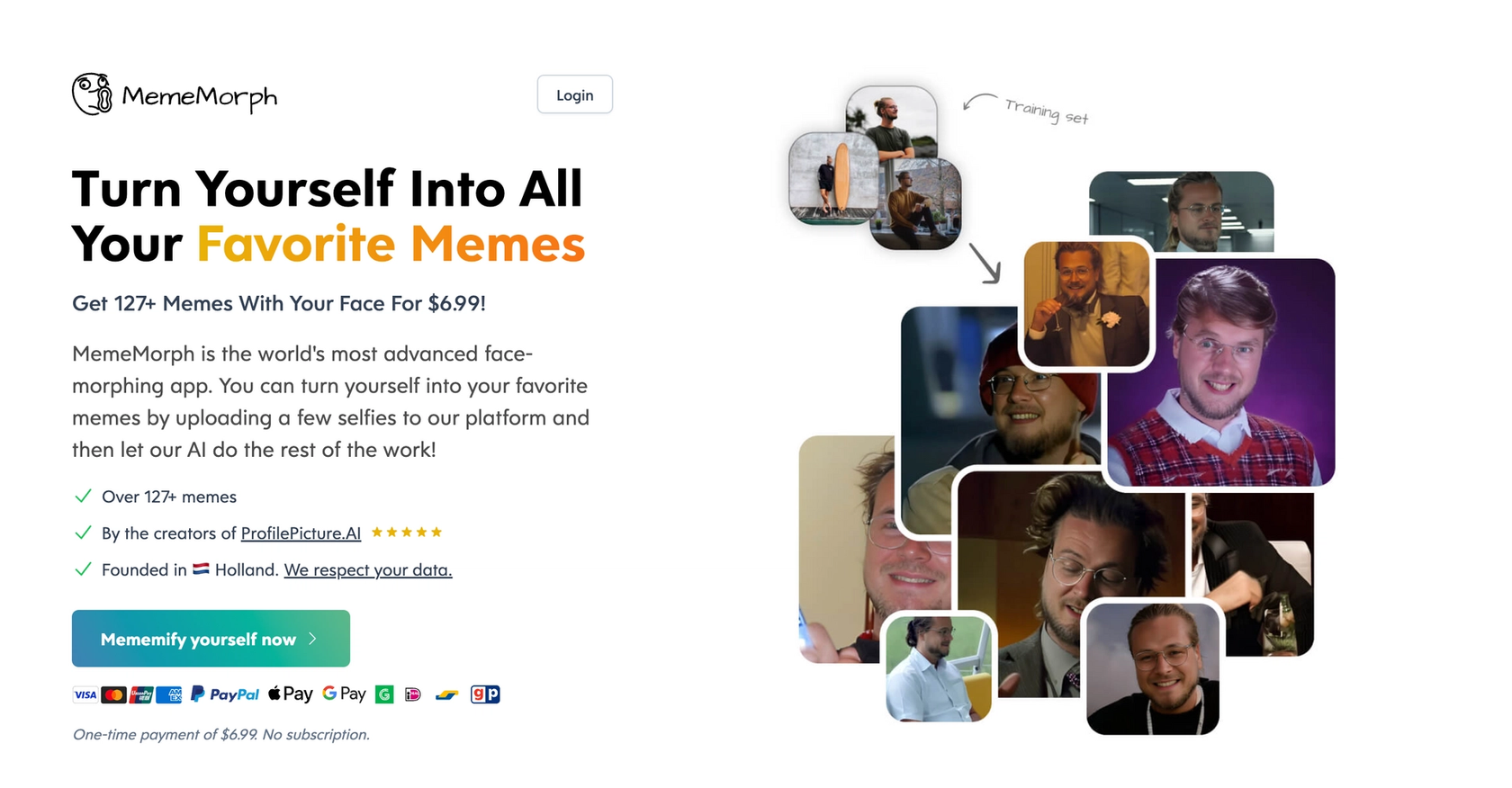 MemeMorph’s mission is to make creating memes easier than ever before. We want everyone to be able to make their memes, so we built our AI-powered face-morphing technology so anyone can do it.